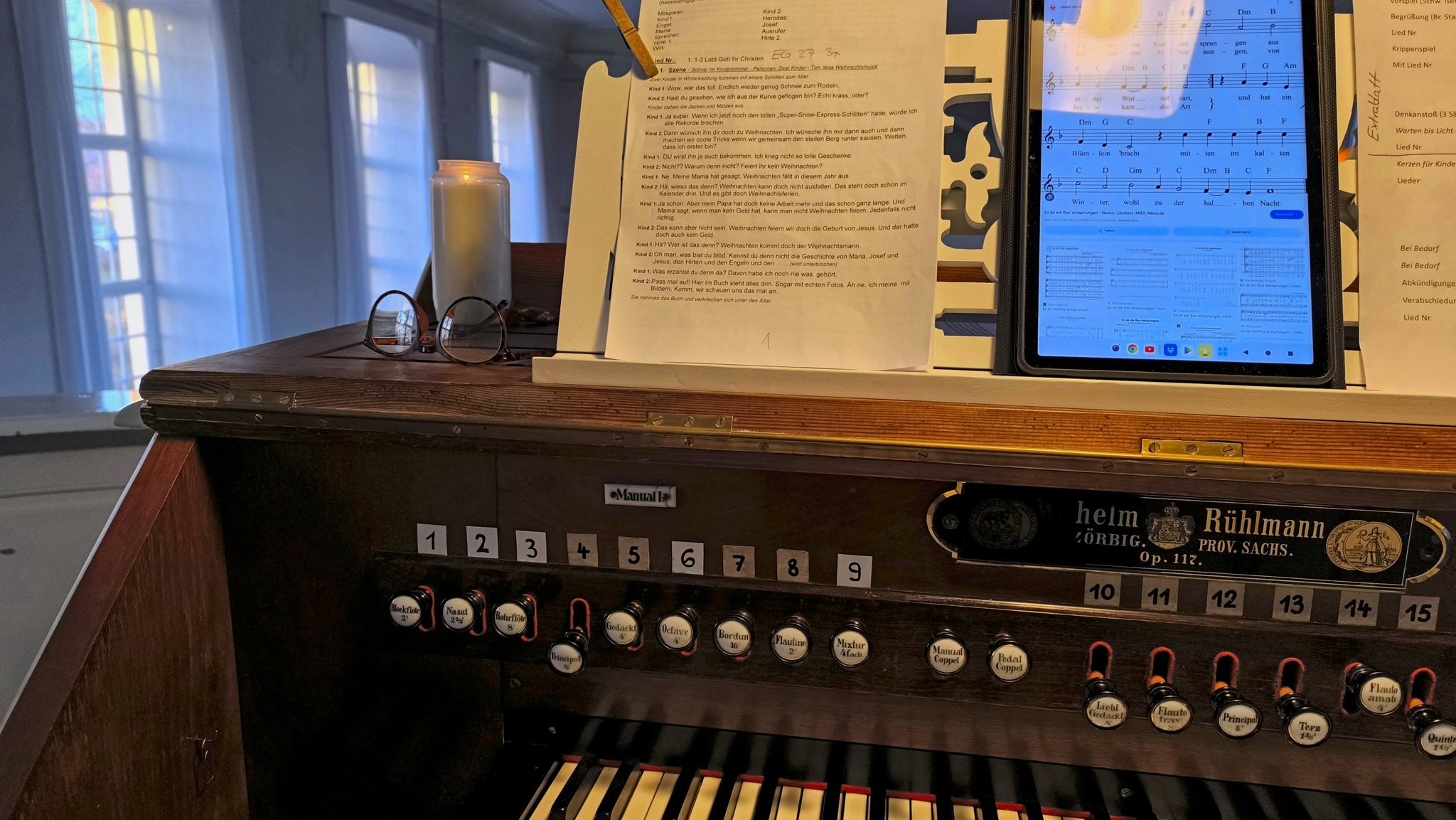Meine Orgel (Rühlmann op. 117) in Gnadau. Auch hier eine Kerze für die Opfer vom Weihnachtsmarkt.