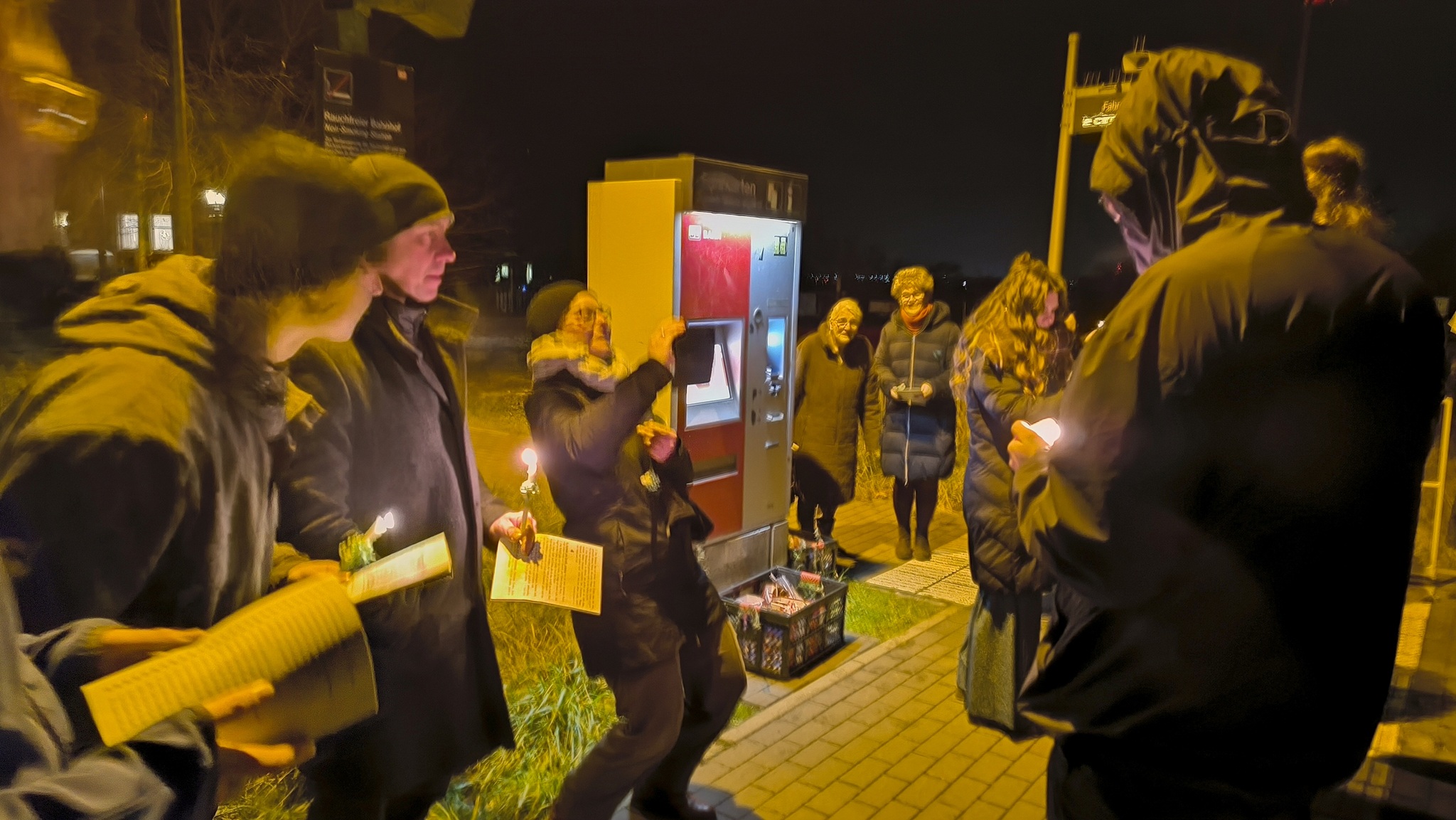 Zum Schluss das Bahnsingen am Haltepunkt Gnadau. Zwei Züge kommen zu dieser Zeit an. Wir gehen zum TF und zum ZuB und geben ihnen eine kleine Weihnachtstüte und singen. Es wird immer freudig angenommen.